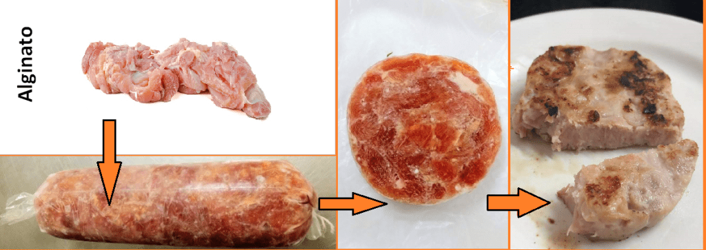 En el punto anterior establecimos que el mecanismo de unión entre las piezas de carne con transglutaminasa ocurre por la formación de enlaces químicos entre las proteínas (polimerización). En el caso del alginato, el mecanismo es más sencillo. Imagina que tomamos varias piezas de carne, las juntamos todas y las atrapamos dentro de una gelatina, sólo que en este caso el gel de alginato no es termorreversible, es decir no se va a fundir o deshacer con el calor tal como sucedería sí usáramos gelatina. Así que de esta manera, las piezas de carne quedan unidas mediante este gel de alginato, el cual no es perceptible cuando se mezcla con la carne que contiene proteína extraída por el trabajo mecánico del proceso de reestructurado en frío.