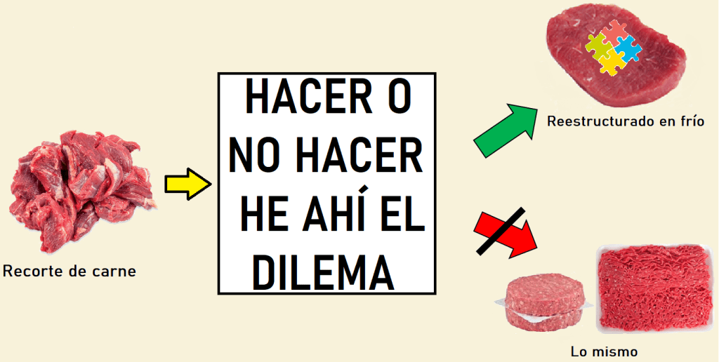 La reestructuración, en palabras sencillas, es un método para unir músculos de bajo valor comercial o recortes de carne para formar una pulpa que se asemeje a una pieza o a un músculo de carne de mayor tamaño. Es como tomar pequeñas piezas de lego o de rompecabezas y armar una figura más grande. Entre los productos cárnicos reestructurados más conocidos están los jamones, las salchichas y las hamburguesas que se elaboran mediante el reestructurado tradicional, llamado también «tecnología de reestructurado en caliente» o «sistema de ligado en caliente«.