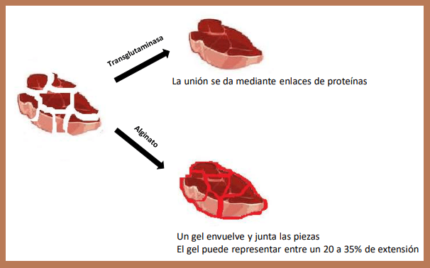 En la ilustración inferior trato de mostrar en forma gráfica los mecanismos de unión entre transglutaminasa y alginato. Con el uso de Tg las piezas unidas se perciben de forma más natural con rugosidades, en cambio con el alginato la superficie de la carne es más lisa y suave por el gel que rodea la carne (en el dibujo el gel de alginato se ejemplifica en color rojo, rodeando las piezas de carne, lo que no ocurre con la Tg que se pegan las piezas entre si).