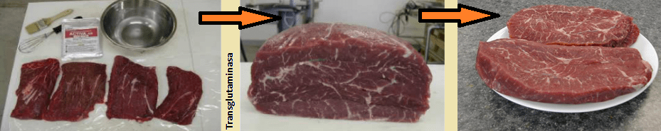 ¿Pero a que viene todo esto? pues es sólo para entender que la enzima transglutaminasa (Tg) es todo lo contrario de la papaína. La acción de la enzima Tg es polimérica o de adición, es decir va a formar enlaces entre proteínas o entre una misma proteína para formar cadenas o estructuras más grandes y es precisamente esa característica la que contribuye a unir 2 piezas de carne pero aún así no es suficiente. Para que la unión entre 2 o más piezas de carne sea firme y resistente se necesita una concentración crítica de proteína y debido a esto es muy importante que sepas que en el mercado vamos a encontrar diferentes sistemas de transglutaminasa mezcladas con proteínas o azúcares, por ejemplo: